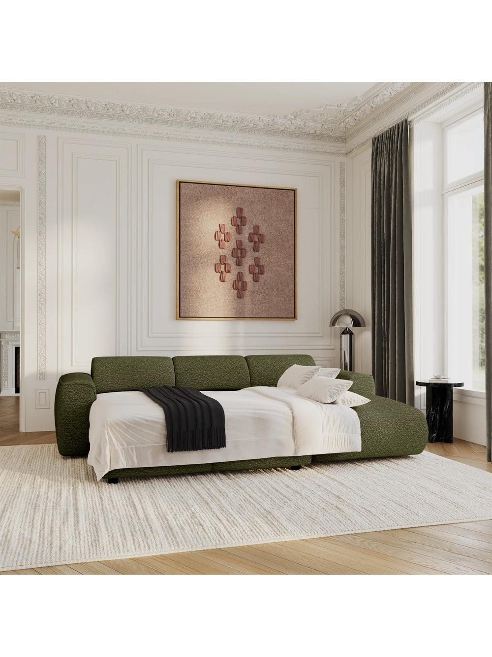 Canapé angle droit convertible 283cm en tissu bouclette vert olive YUMA