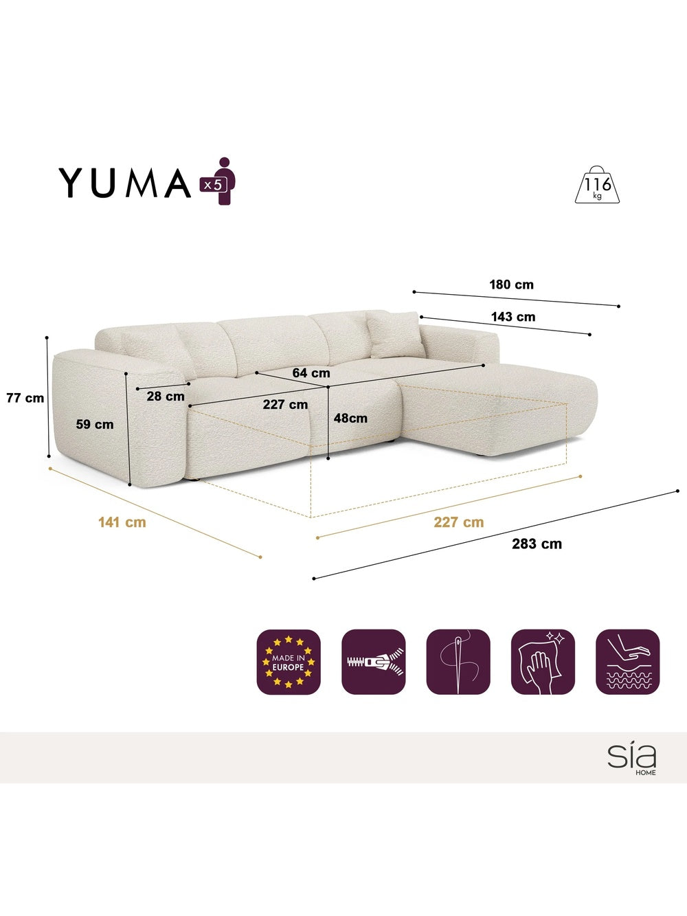 Le canapé grand angle droit Yuma en tissu bouclette offre un espace généreux et une fonction convertible idéale pour les grands salons. Son design moderne et ses lignes accueillantes en font une pièce centrale conviviale, parfaite pour se détendre ou recevoir.